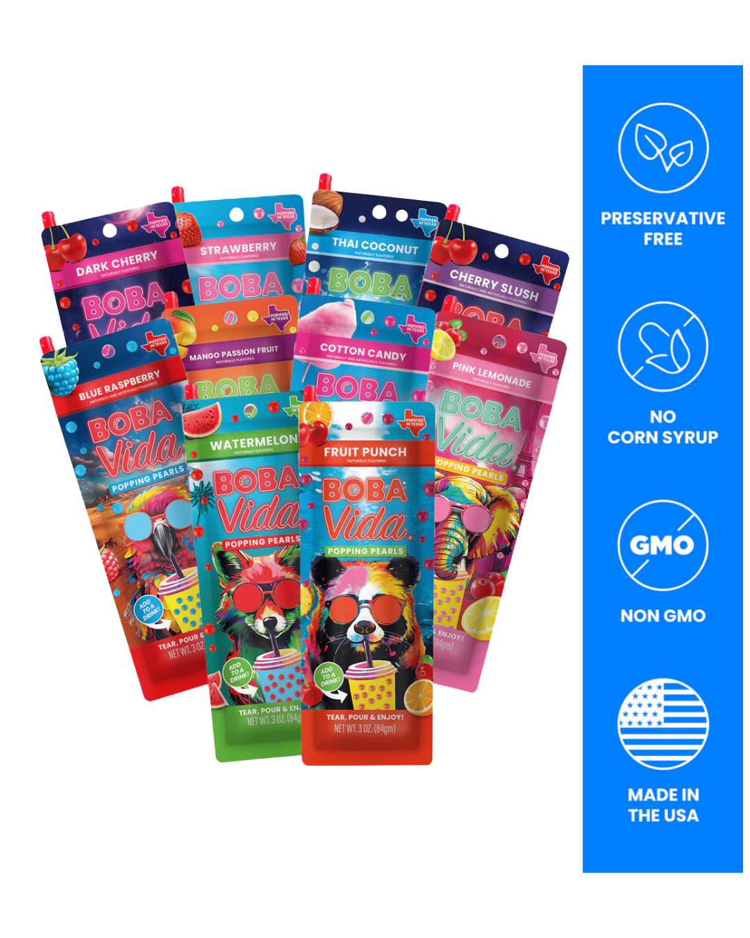 Explore BobaVida's Fruity Popping Boba Pearls in Blue Raspberry, Mango Passion, Cotton Candy, and more, with 10-pouch variety packs for every occasion!